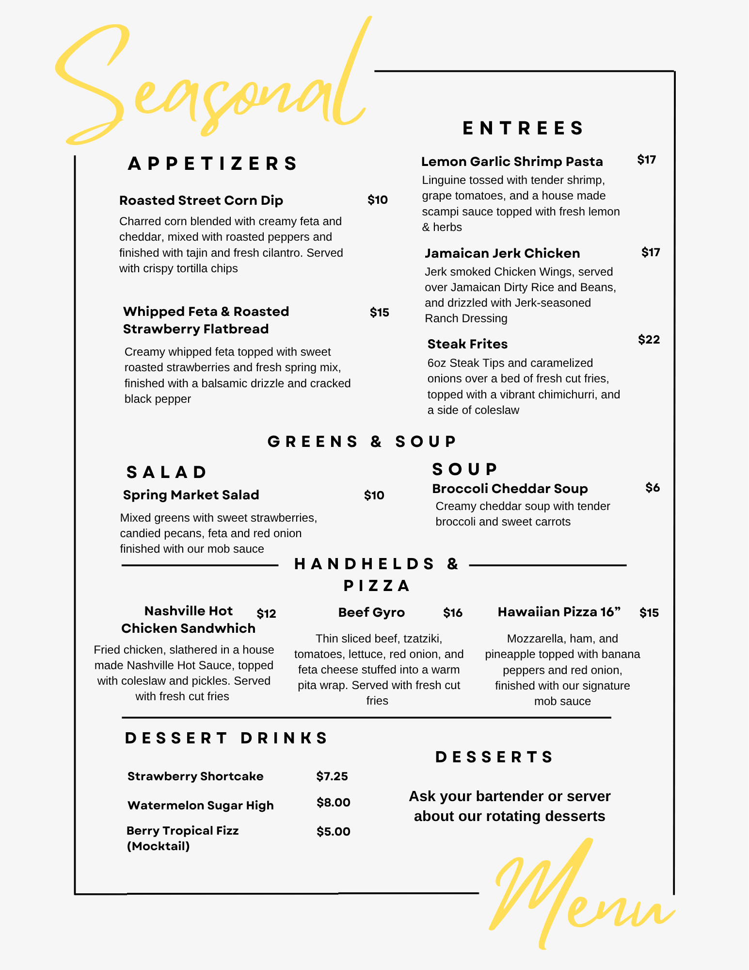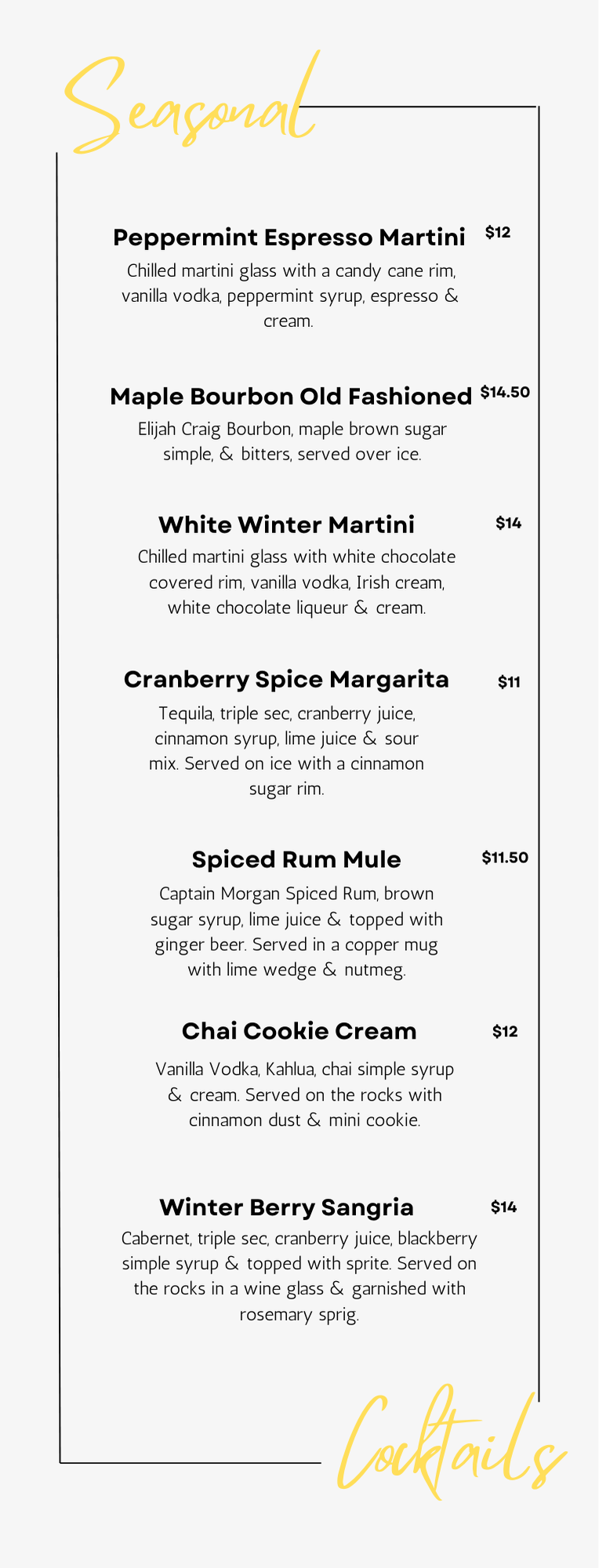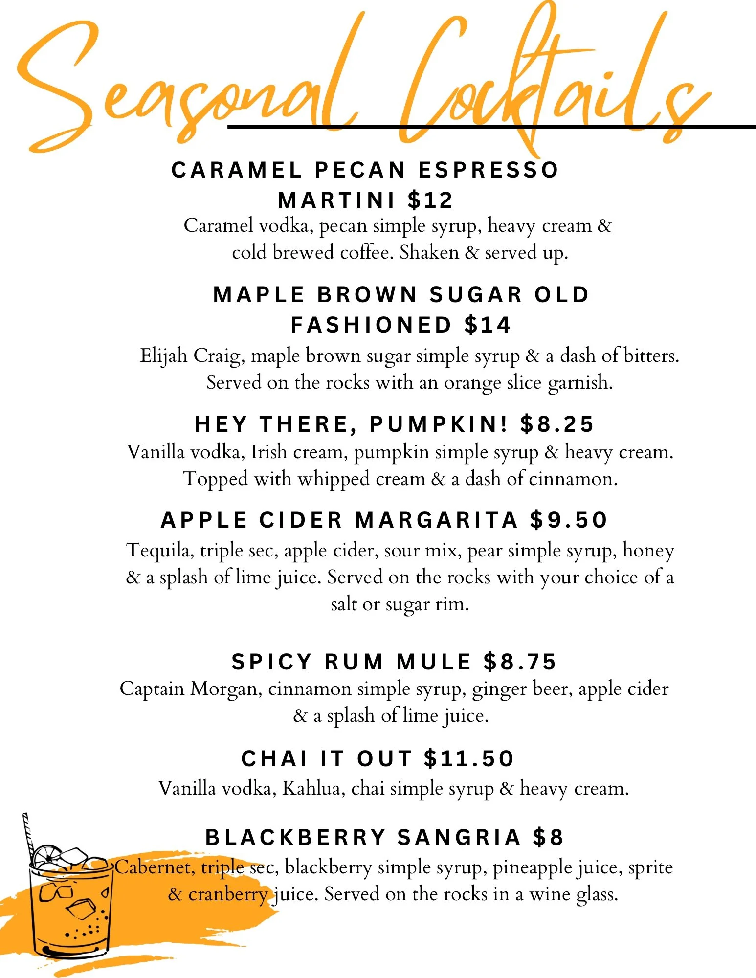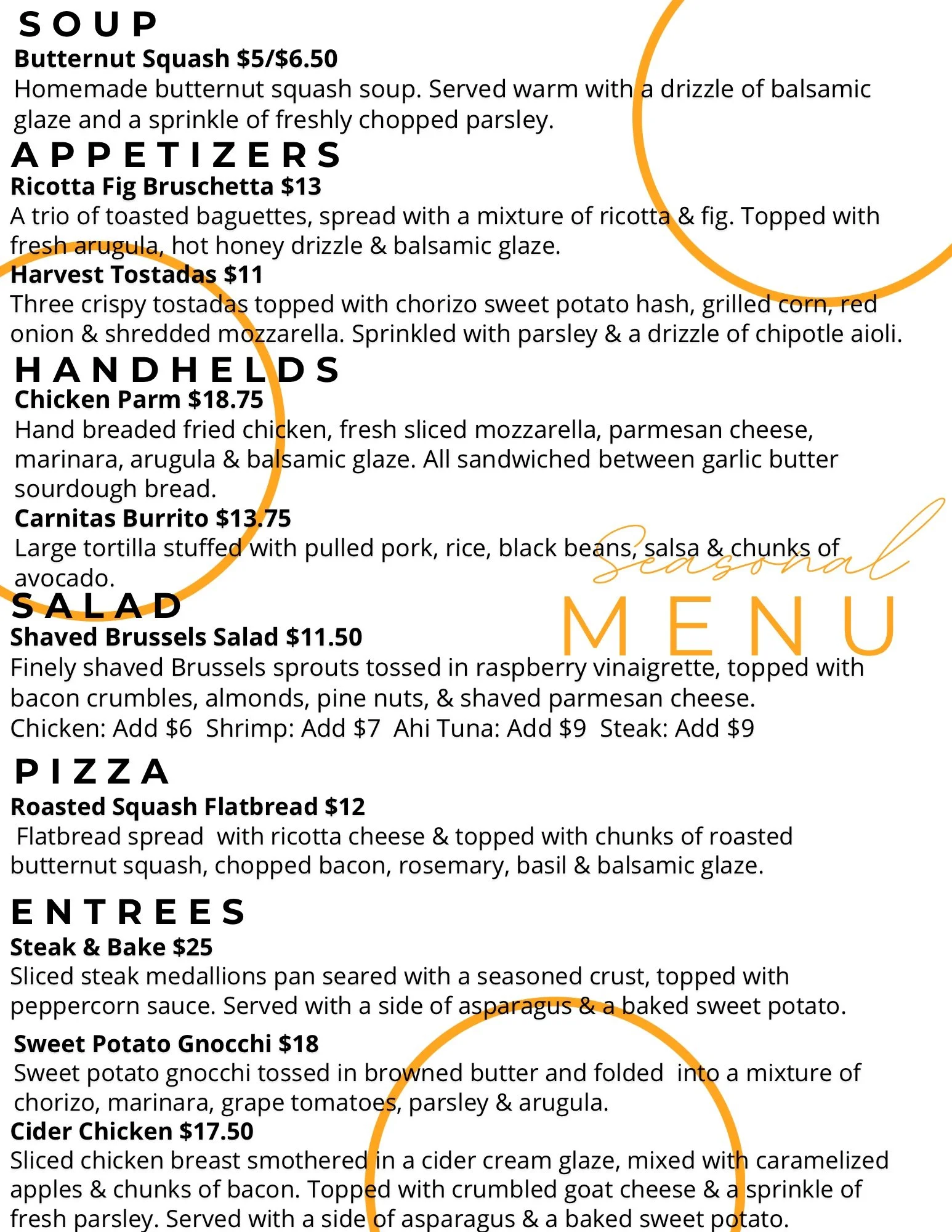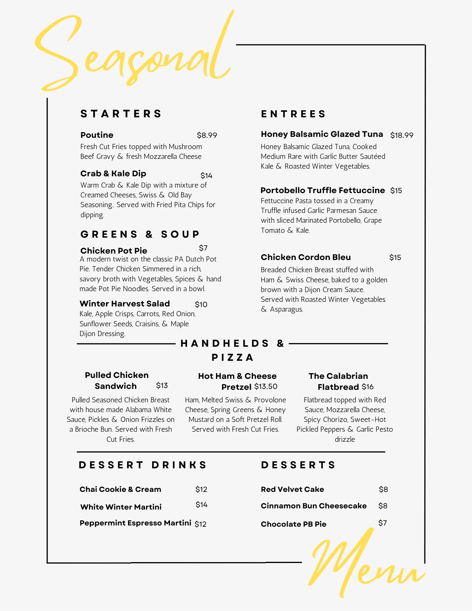 enticing pub menu. Join us for lunch, happy hour or dinner inside our